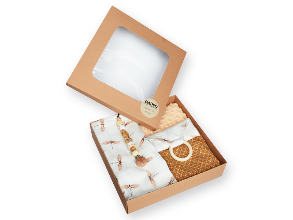 Miminko na cestě a nemáte žádný nápad na dárek? Zkuste naše dárkové sady. Sada obsahuje deku do kočárku Minky, kteoru bude miminko milovat, lehounkou mušelínovou deku s vážkami pro horké letní dny, usínáček s kroužkem, klip na dudlík z dřevěných korálků, aby byl dudu vždy po ruce a hřejivý polštářek s pecičkami, aby bříško nebolelo. Krásný dárek do kouta.