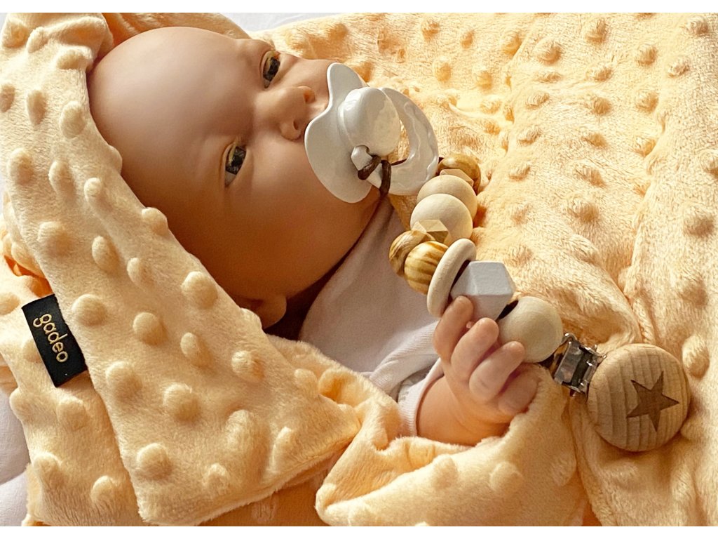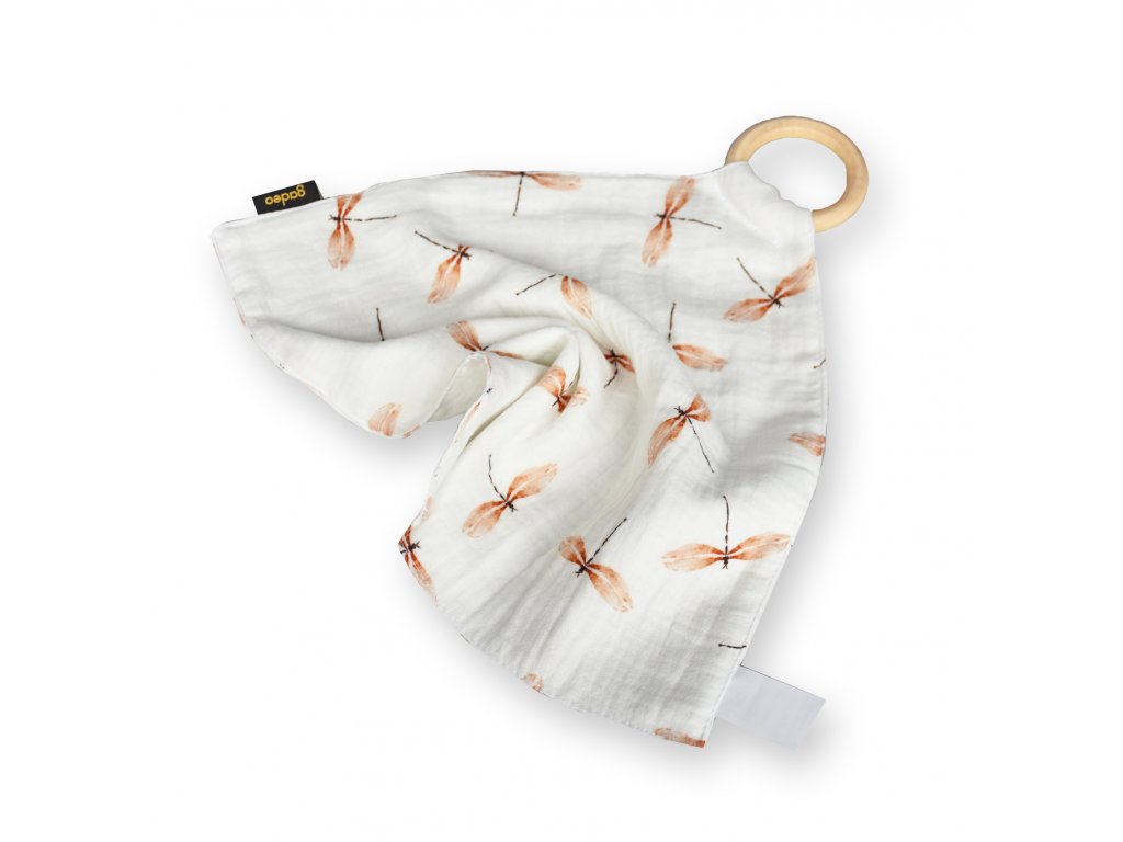 Mazlivá dečka s dřevěným kroužkem je ideální na pomazlení před usnutím. Kroužek je akorát do dětské ručičky. Textilní část je ušitá z lehkého hebkého mušelínu, příjemného na dotek.