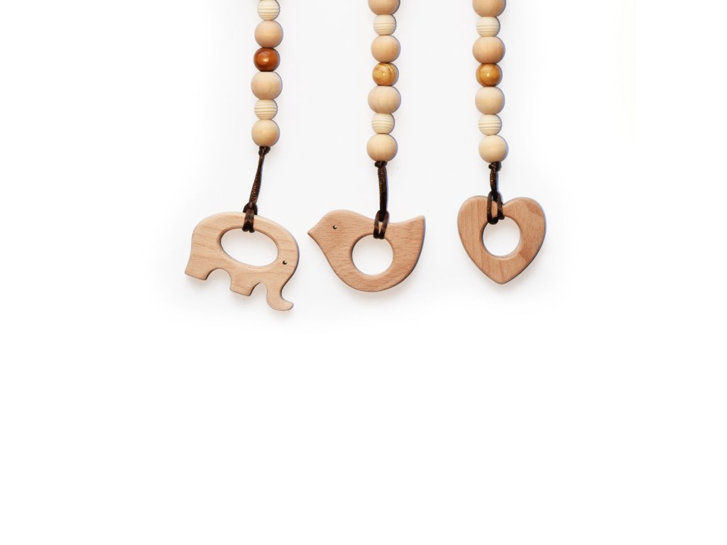 Dřevěné kousátko na konci stužky je dodáváno dle skladové dostupnosti ( slon, srdíčko nebo ptáček ).