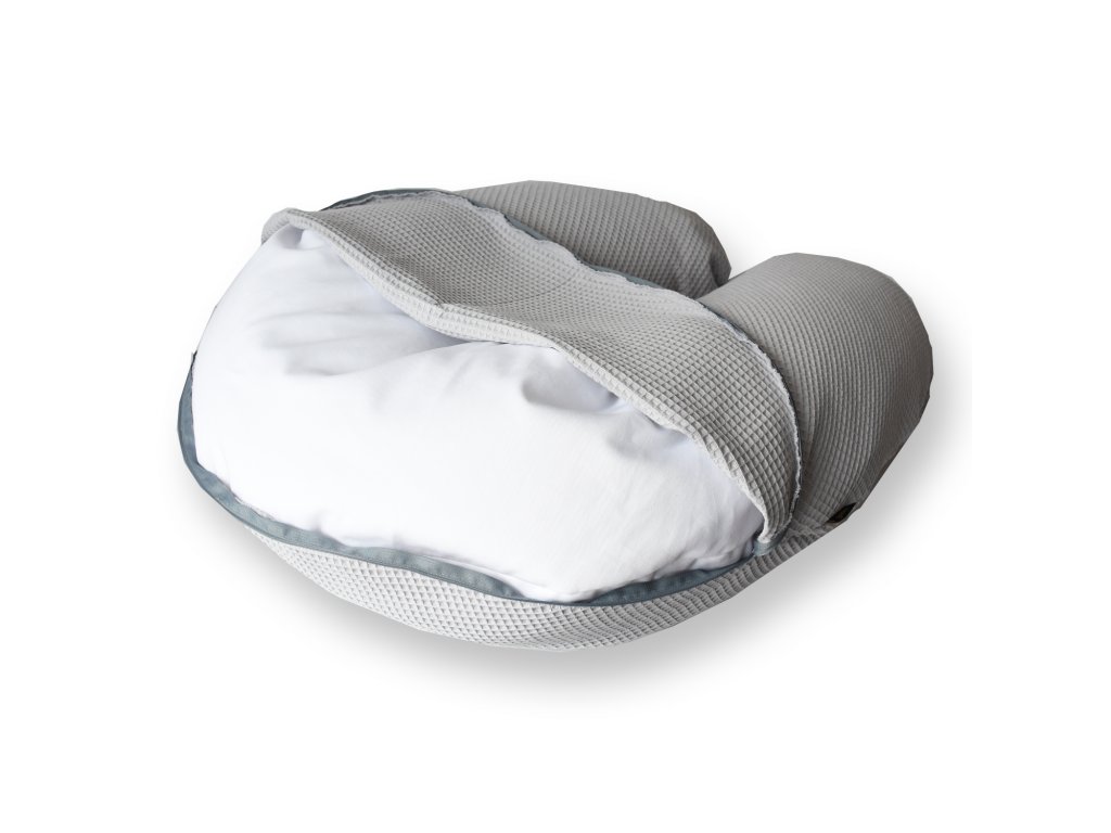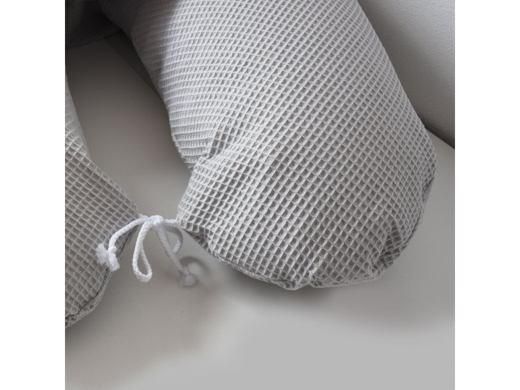 Povlak je ze 100% bavlny s hrubší, ale měkkou vaflovou strukturou. Má dostatečně dlouhý zip pro snadné sundání, ve spodní části jsou tkanice pro svázání konců polštáře k sobě, čímž vznikne bezpečné a pohodlné hnízdo pro Vaše miminko.